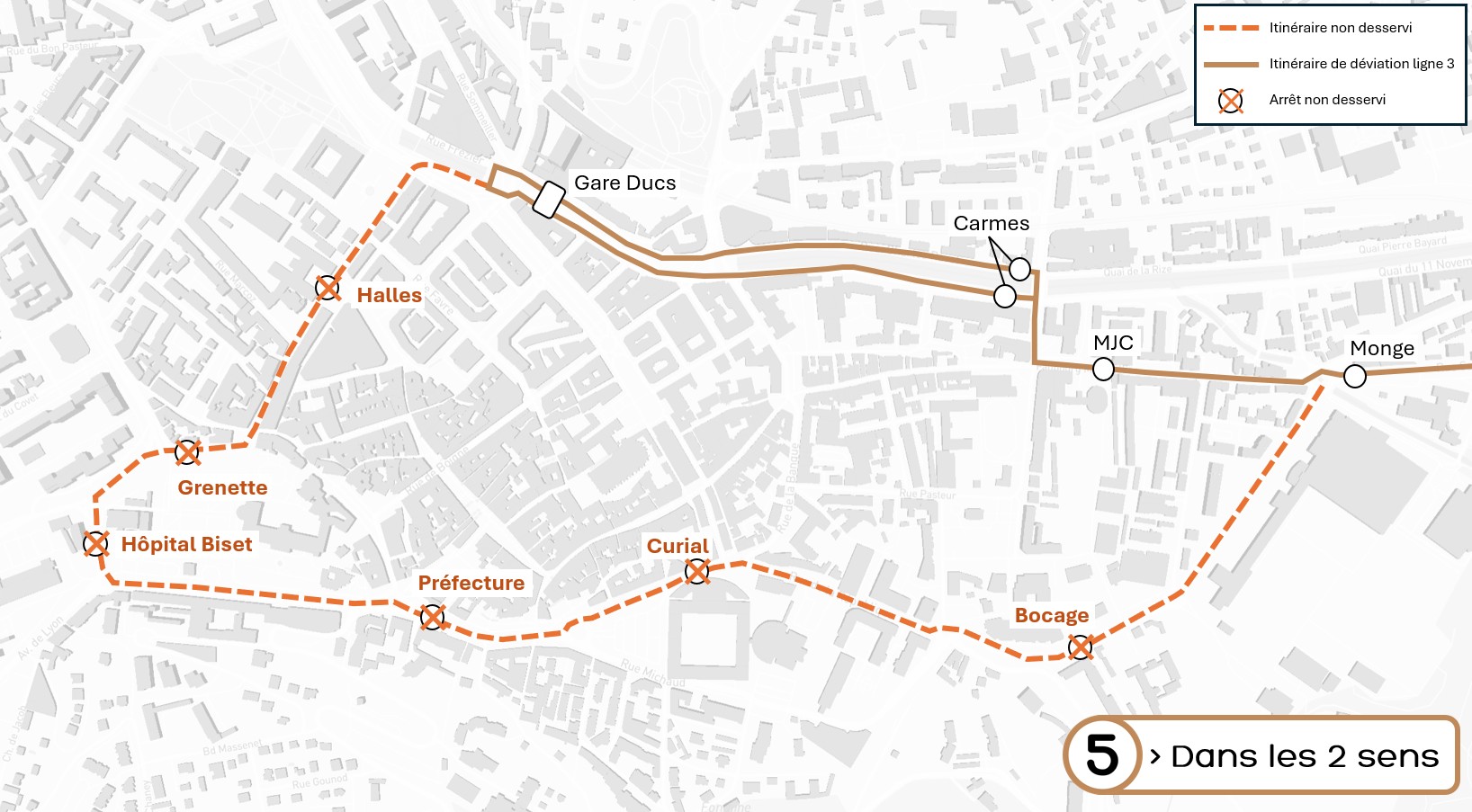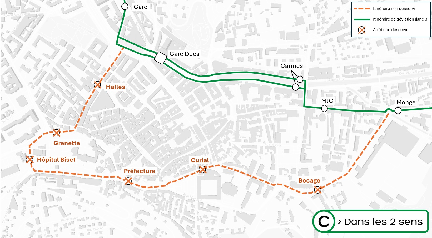Les arrêts « Gare Ducs » et « Place d’Italie » sont neutralisés et reportés à l’arrêt « Halles ». Les arrêts « Curial » et « Préfecture » sont neutralisés et reportés à l’arrêt « Hôpital Biset ».