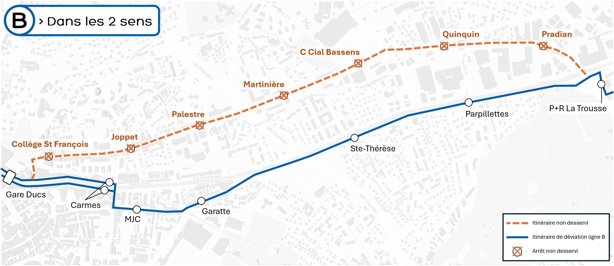 Les arrêts « Martinière » et « Centre Commercial Bassens » sont neutralisés et reportés à l’arrêt « Sainte Thérèse ».