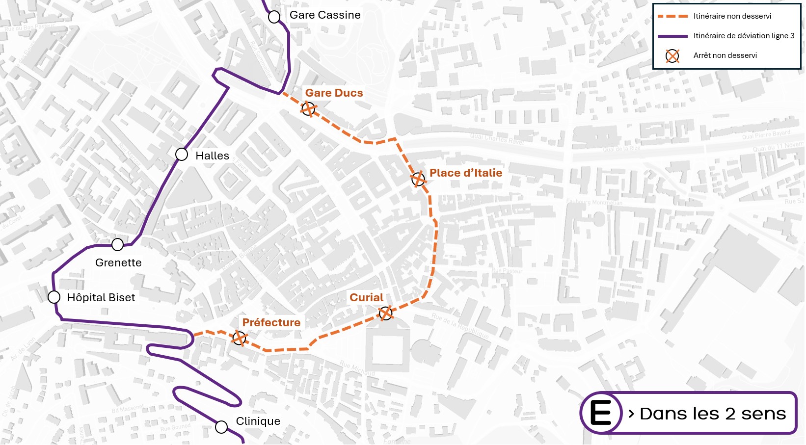 Les arrêts entre « Piochet » et « Pellerin » sont neutralisés et reportés à l’arrêt « Hermitage ». Les arrêts entre « Rotonde » et « Gare Cassine » sont neutralisés et reportés à l’arrêt « Gare Reclus ».