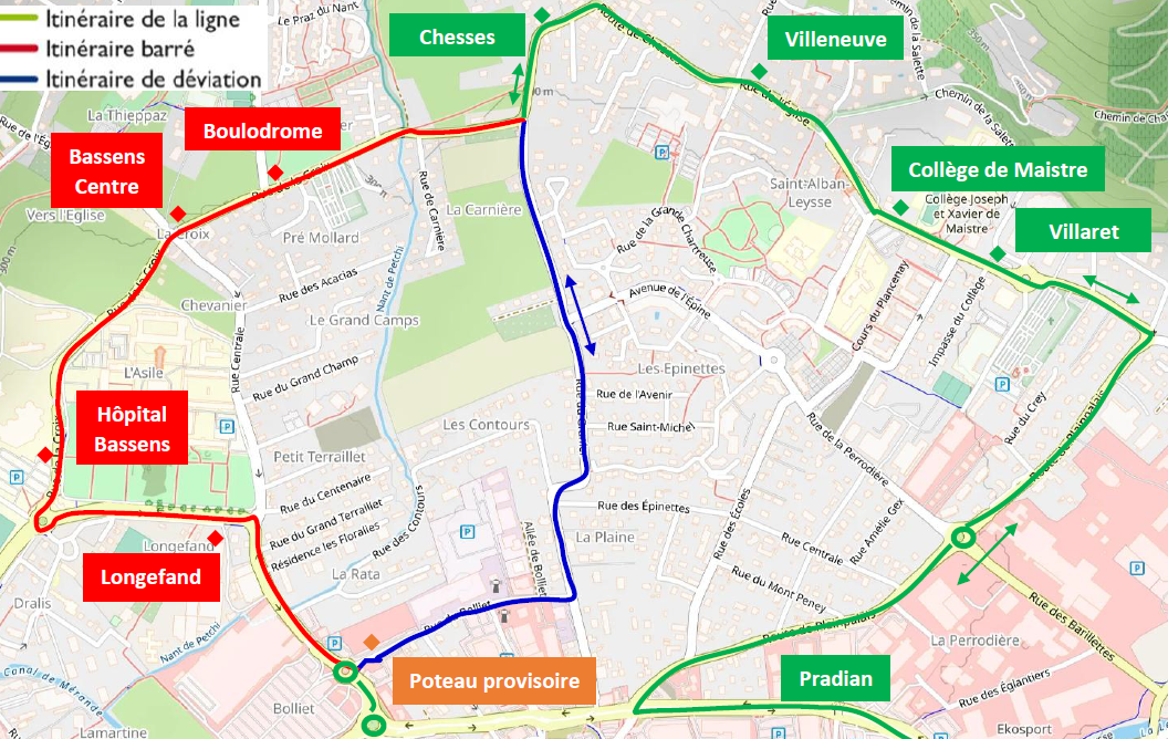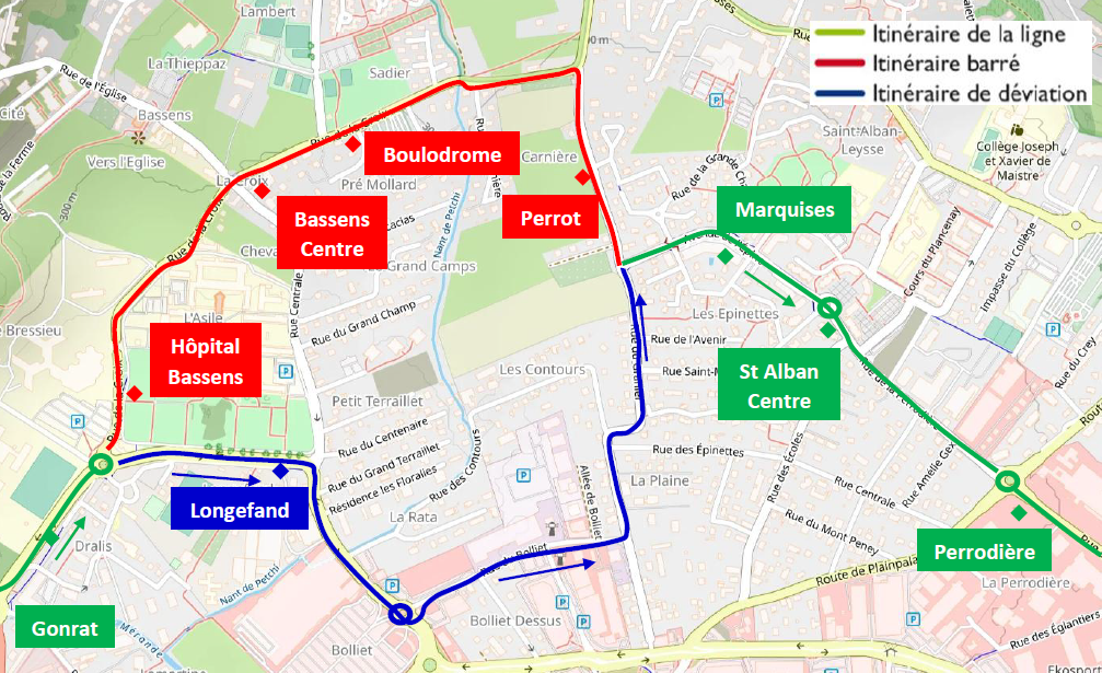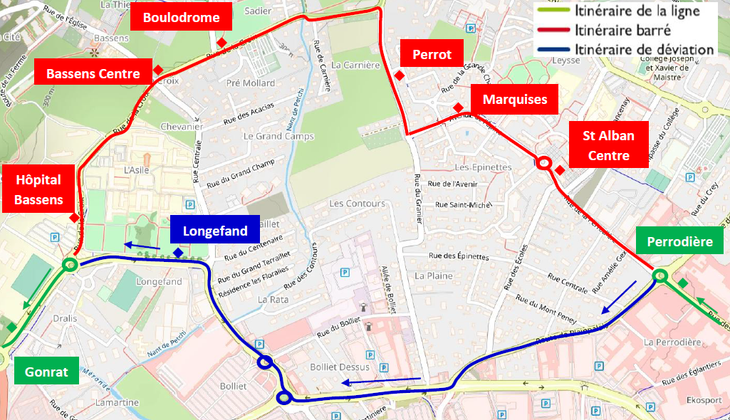 Les arrêts « Hôpital Bassens », « Bassens Centre » et « Boulodrome » sont neutralisés et reportés à l’arrêt « Longefand ». Les arrêts « Perrot » « Marquises » et « St Alban Centre » sont neutralisés et reportés à l’arrêt « Perrodière ».