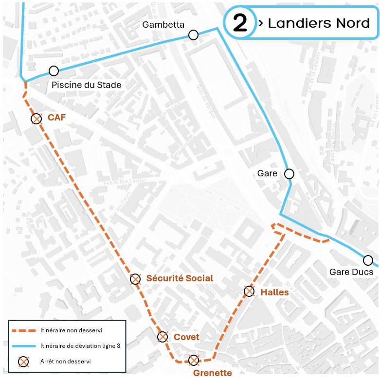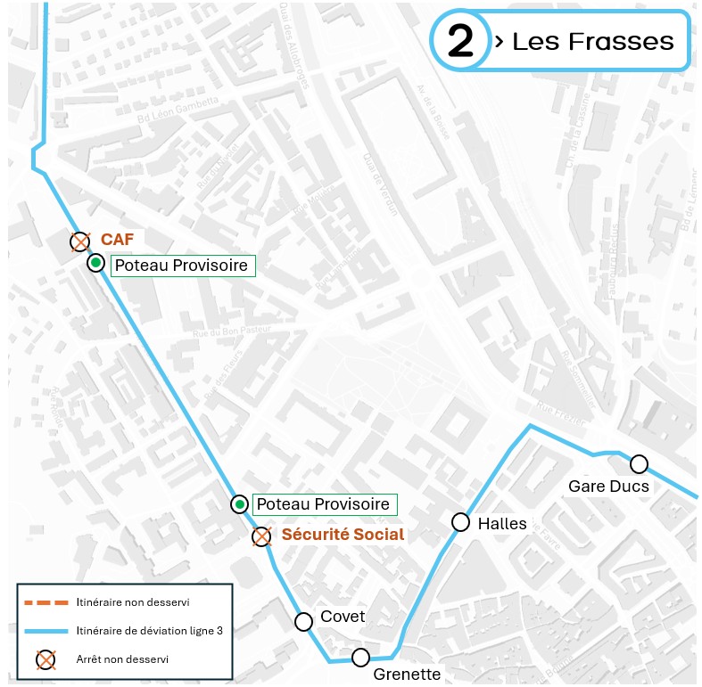 L’arrêt « Caf » est neutralisé et reporté à l’arrêt « Piscine du Stade ». Les arrêts « Sécurité Sociale », « Covet », « Grenette » et « Halles » sont neutralisés et reportés à l’arrêt « Gare ».